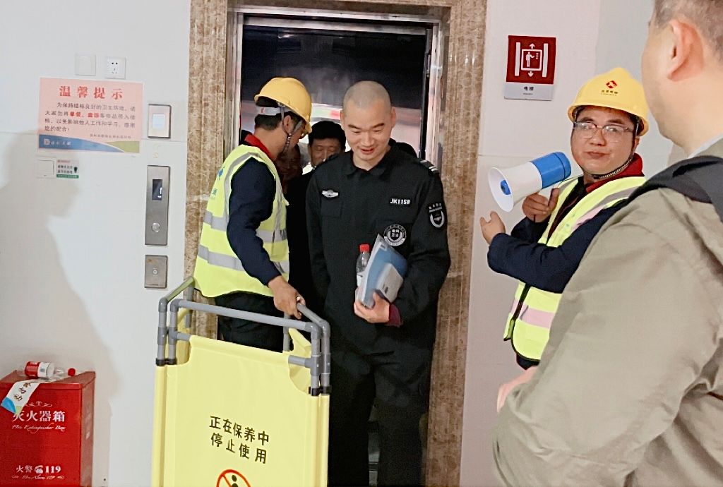 应急救援演练现场,后勤工作人员、物业管理人员及学生代表作为志愿者进入电梯,模拟因故障被困情景。电梯维保人员分别在电梯内外及监控室,同步讲解电梯在不同状态下的困人施救方法,并现场演示“五方通话”的使用方法。师生们全程观摩了从被困人员呼救、维保人员接到救援电话后及时赶到、安抚被困人员、设立警示牌、排查故障、安全解救被困人员、恢复电梯运行全过程。