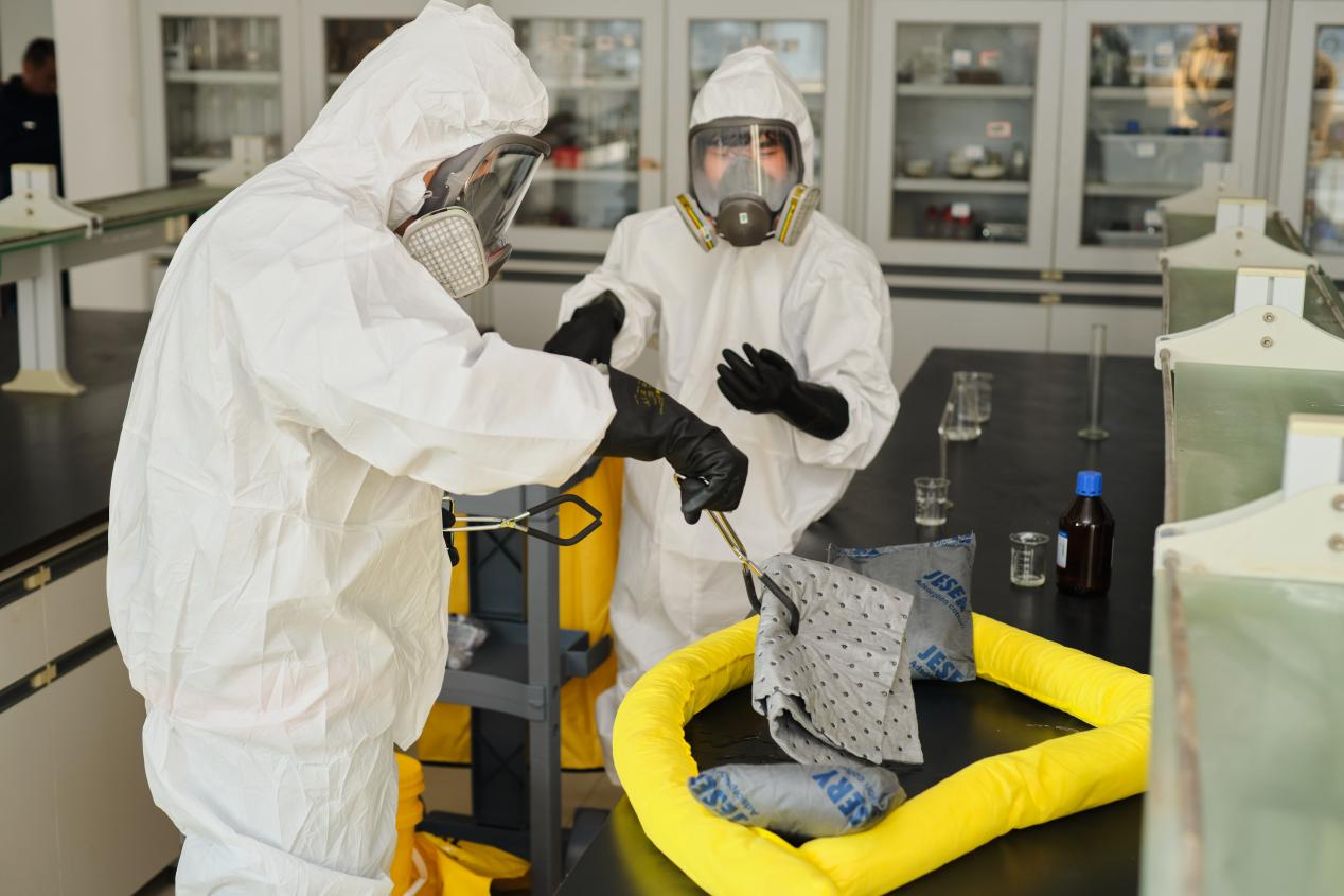 本次演练模拟学生在实验时化学品(有机试剂)泄漏的场景,通过确认险情、现场救援、清理及洗消三个环节来演示化学品泄漏的应对措施,直观、明确地展示了化学品泄漏的危害以及处理方案。参演同学根据演练预案,分工协作,认真演练每个环节,顺利完成规定内容的演练,达到了预期成效。