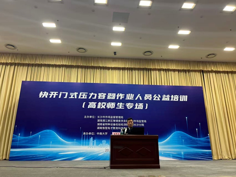 为进一步加强高校实验室特种设备安全管理,规范师生安全操作行为,提高实验室师生的特种设备作业安全知识和技能水平,4月1日下午,湖南湘江新区管理委员会商务和市场监管局联合长沙市市场监督管理局、湖南省特种设备检验检测研究院长沙分院在中南大学潇湘校区中南讲堂联合举办快开门式压力容器作业人员公益培训(高校师生专场),湖南湘江新区商务和市场监管局党组成员李雄飞、长沙市市场监管局特种承压设备安全监察处处长姚景州、湖南省特种设备检验检测研究院长沙分院院长黄雪优,中南大学资产与实验室管理处和湖南大学实验室与设备管理处等相关领导出席活动。